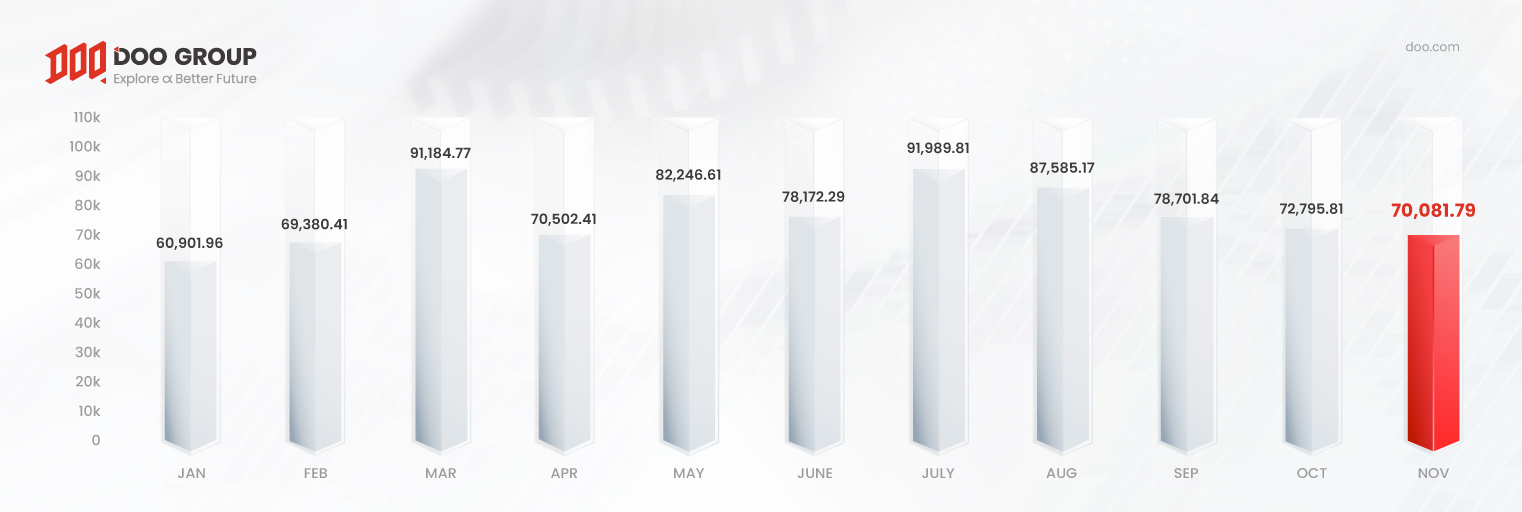 According to the report, Doo Prime’s total trading volume in November 2023 is valued at USD 70.08 billion, a slight decline of 3.73% from the previous month. Furthermore, November’s average daily volume (ADV) is USD 2.34 billion, a slight decrease of 0.52% from October.