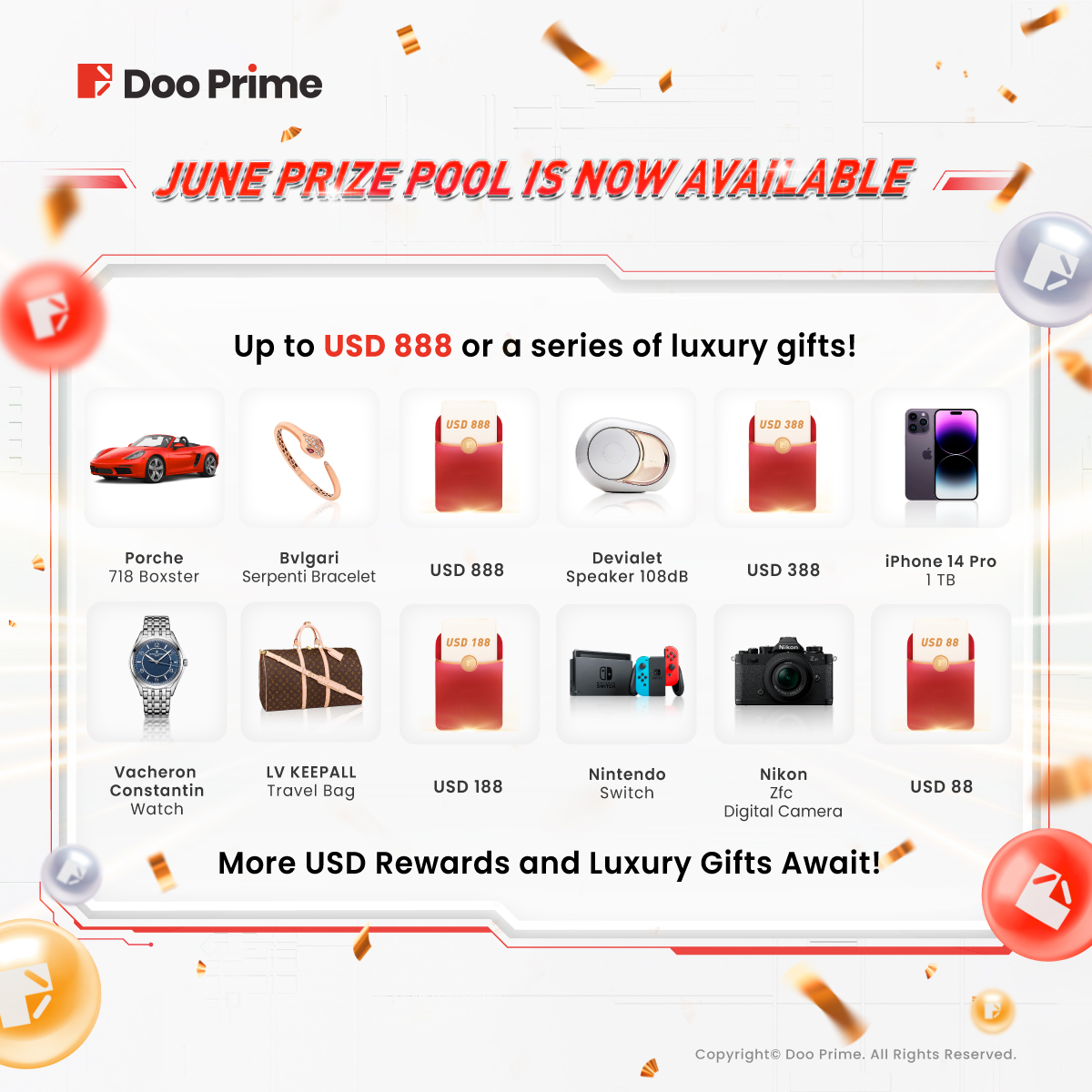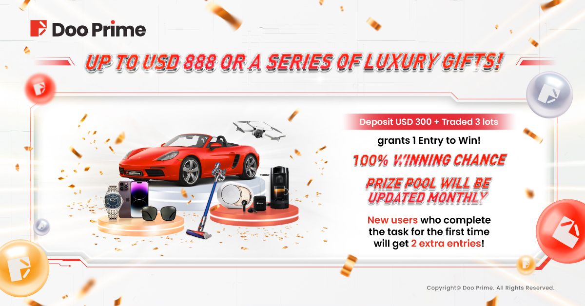 Doo Prime is thrilled to announce the launch of the “Mid-Year Global Giveaways” event, starting from now until August 31, 2023 (UTC+0). In addition to the generous cash prize of up to USD 888 in a single draw, we have prepared over 1,000,000 luxury gifts too! We hope that these prizes and delightful presents will bring joy and excitement to your trading journey.