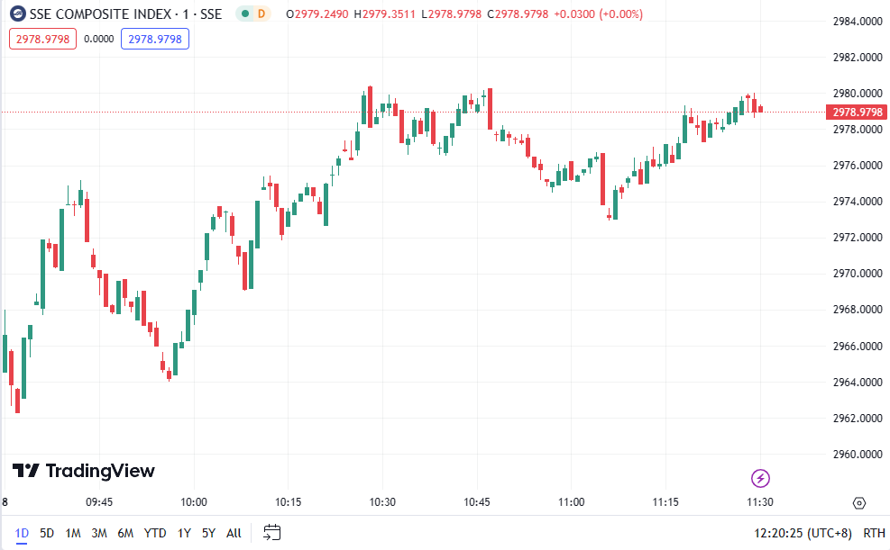 • Shanghai Composite Index (SHCOMP) rose by 0.43%, closing at 2,978.98 points.