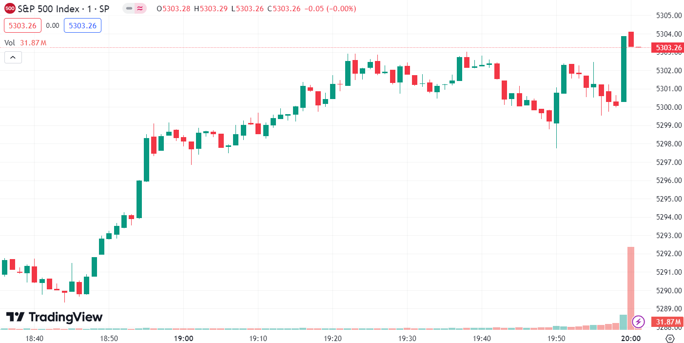 - S&P 500: Up 6.17 points (+0.12%) at 5,303.27