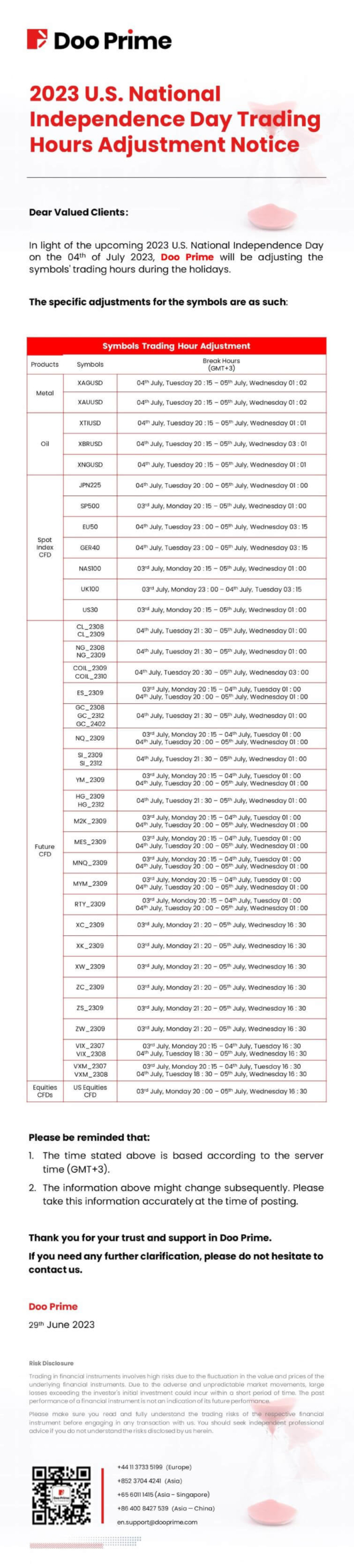 2023-06-29 | Holiday Hours , Trading Hours Adjustment