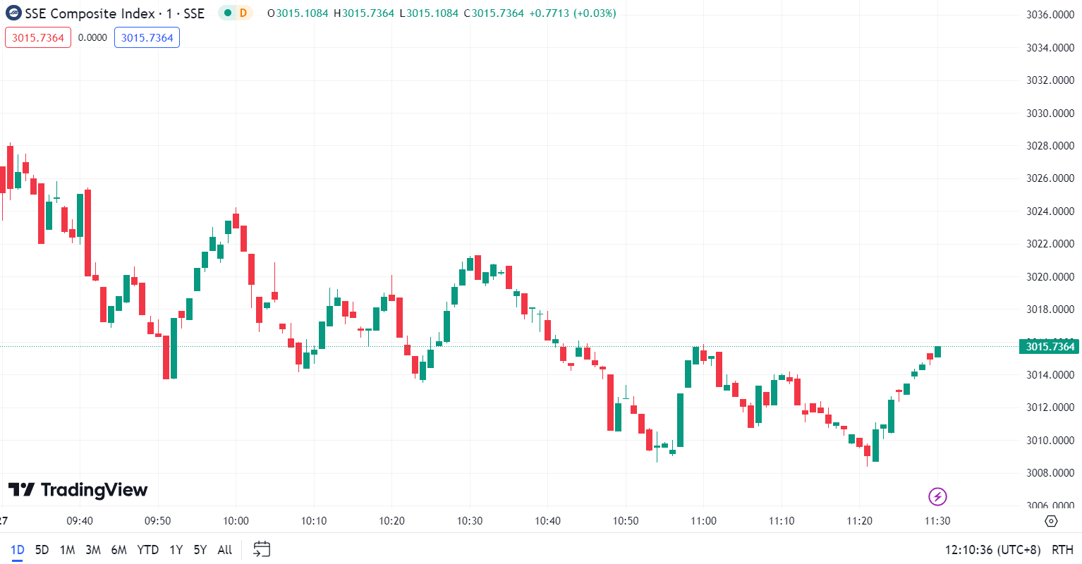 - Shanghai Composite Index (SHCOMP) fell by 0.52%, closing at 3,015.74 points.