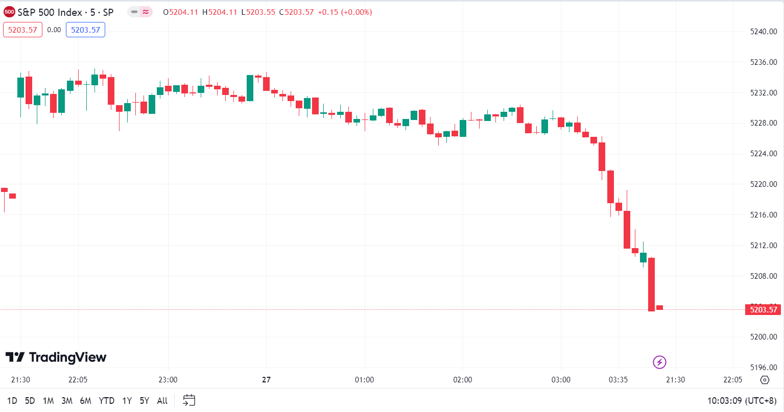 - S&P 500 Index fell by 14.61 points, a decrease of 0.28%, closing at 5,203.58 points.