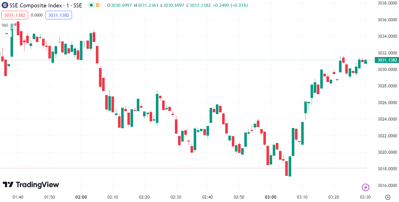 • Shanghai Composite Index (SHCOMP) rose by 0.12%, closing at 3,031.14