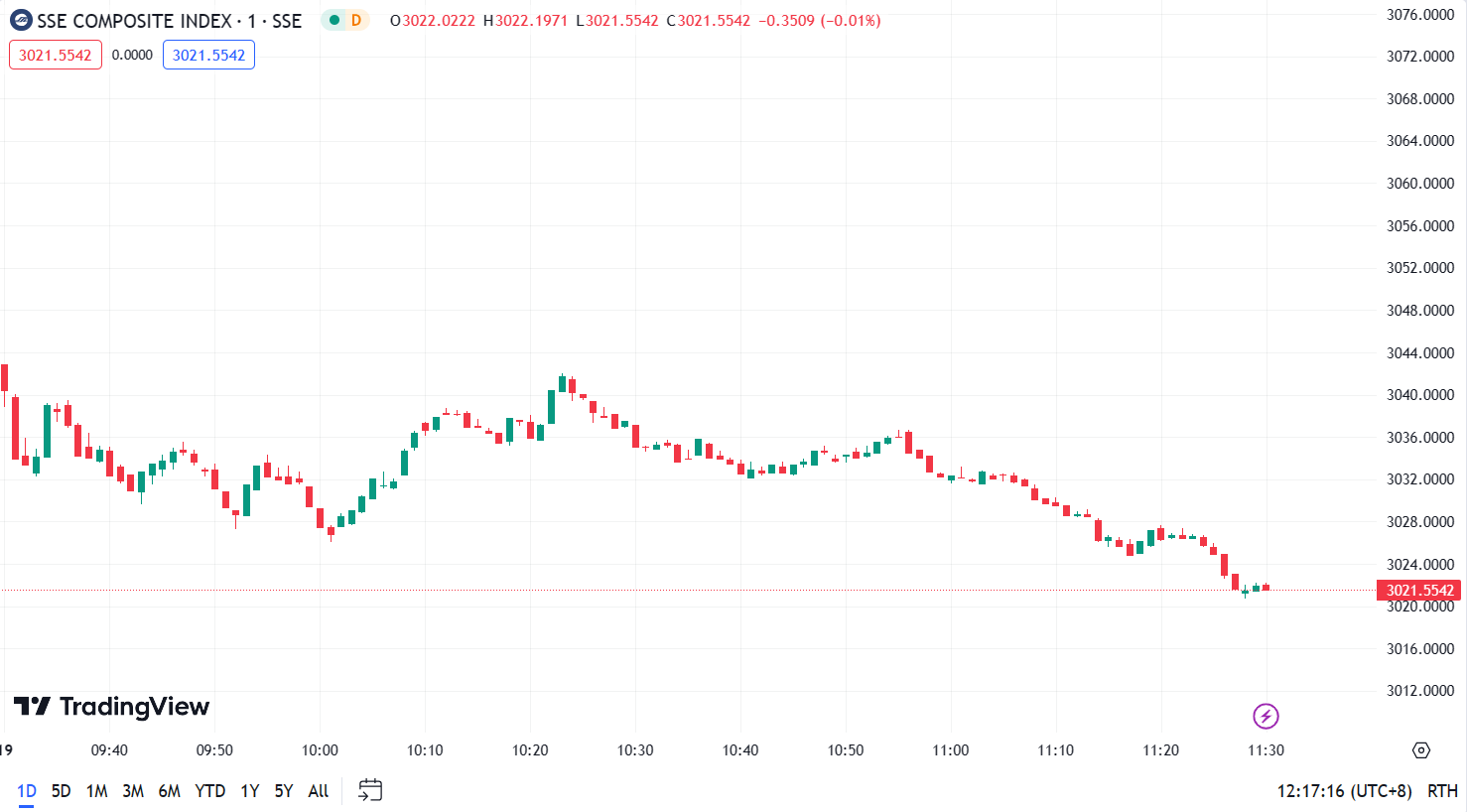 - Shanghai Composite Index (SHCOMP) fell by 1.21%, closing at 3,021.55 points.