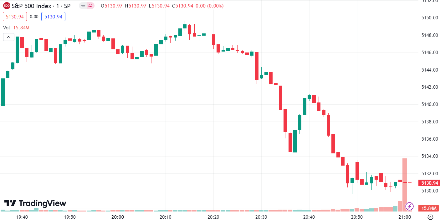 - S&P 500 index fell by 6.13 points, or 0.12%, to close at 5,130.95 points.