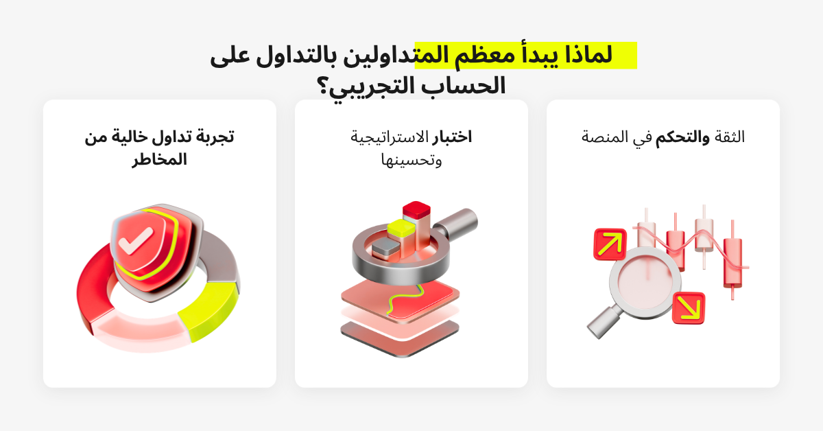 باستخدام حساب تداول تجريبي، يمكنك التأكد من أن استراتيجيتك قد تم اختبارها جيدًا وتحسينها قبل استثمار رأس المال الحقيقي.