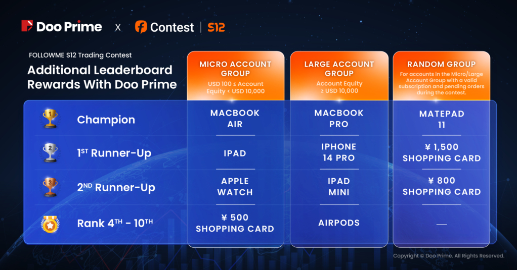 Participants of the FOLLOWME S12 Trading Contest who create a Doo Prime account for the first time through the FOLLOWME platform will not only enjoy the exclusive monthly prize pool, but also have the opportunity to win a MacBook Pro, iPhone 14 Pro, iPad mini or other popular 3C digital prizes upon registering. We look forward to working with and aiding your trading journey during and after the contest.