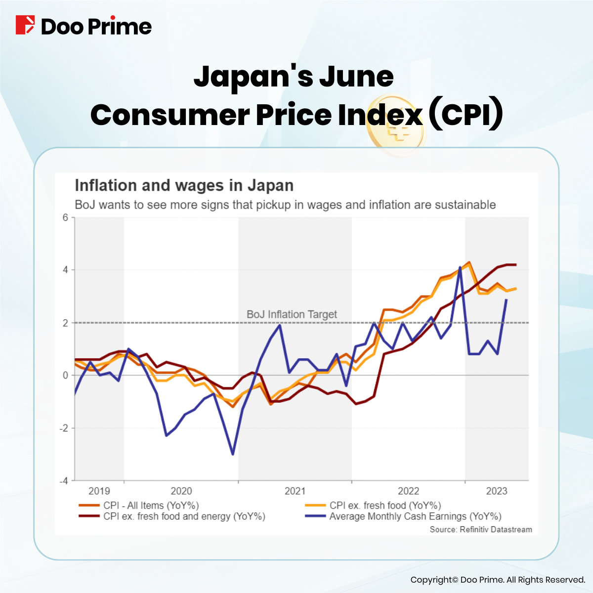 Ueda’s statements shed light on the primary reason for the YCC policy adjustment – inflationary pressure. The current inflationary pressure in Japan is persistent, with the June Consumer Price Index (CPI) at 105.0, marking a year-on-year increase of 3.3%, extending a streak of 22 consecutive months of growth.