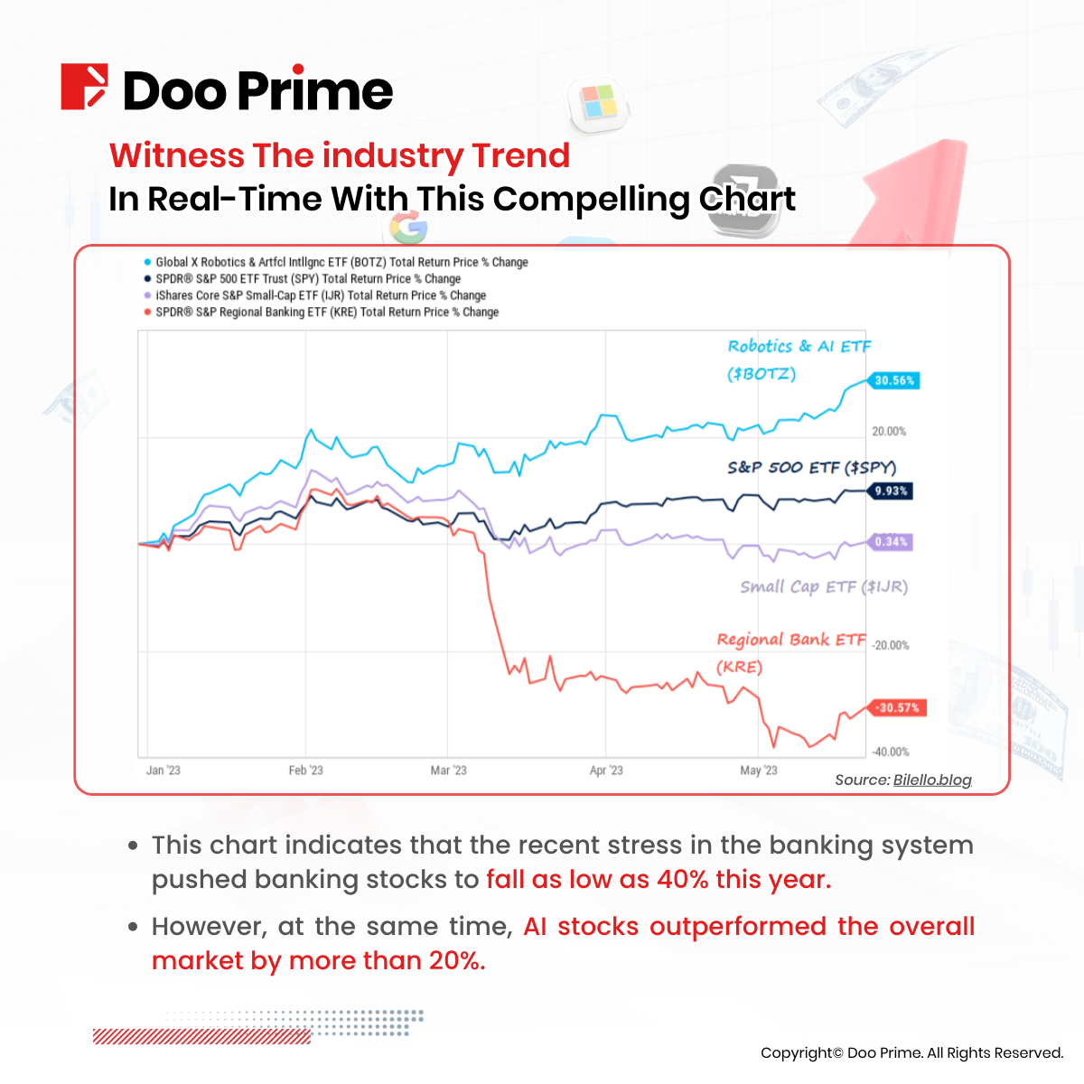 In the current looming recession, characterized by the emergence of the Artificial Intelligence (AI) revolution, investors are predominantly focusing on the Technology and Communication Services sectors. This exemplifies the impact of an industry trend unfolding right before our eyes. To gain further insight, refer to the chart provided below.
