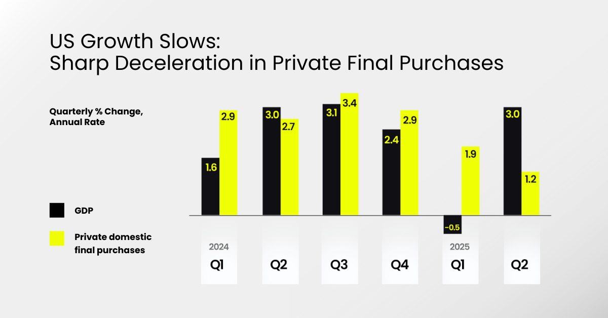 - Private final purchases growth dropped from 2.7% last year to just 1.2%, signaling cooling domestic demand.