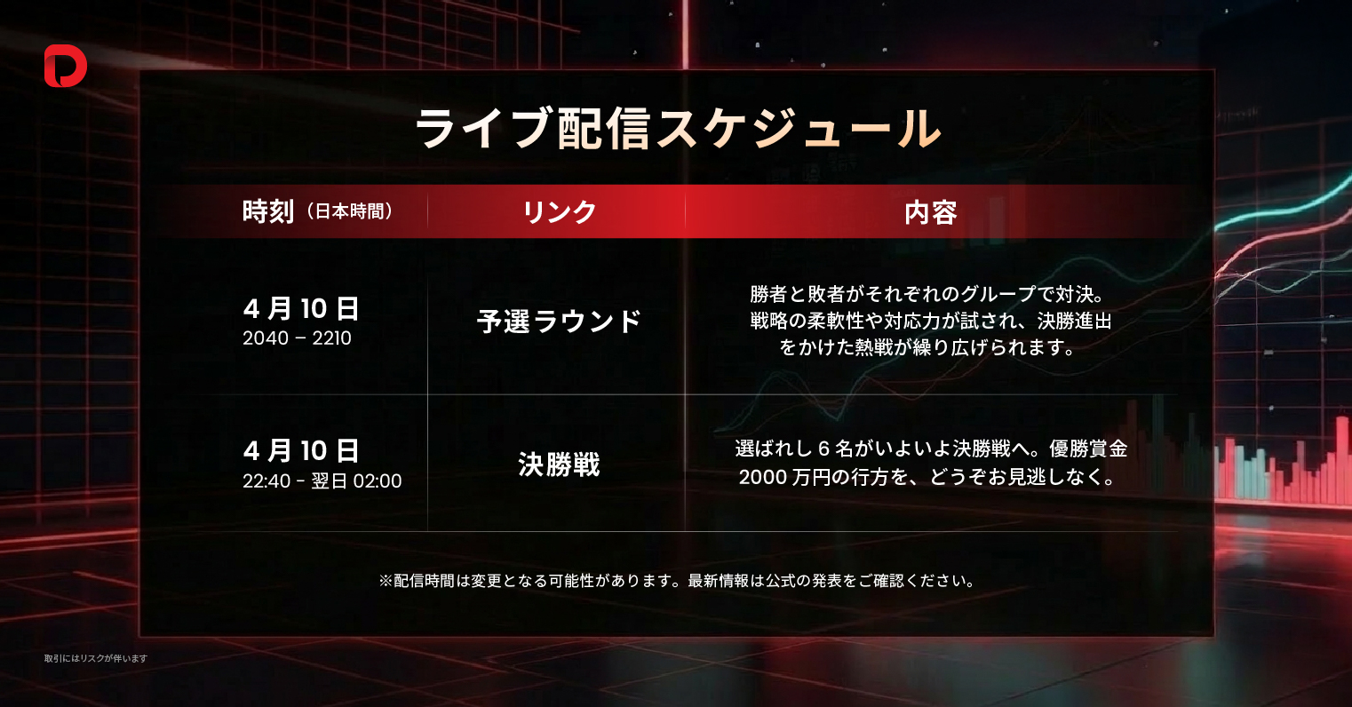 今夜21:00より彼らは「復活戦」に挑み、限られたエリート組への復帰枠をかけた熾烈な戦いに臨みます。一体どの選手が精鋭トレーダーとしての底力を発揮し、決勝の戦いへと駒を進めるのでしょうか?明日の大会速報も是非お見逃しなく!