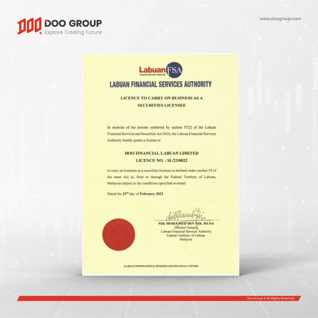 Doo Group 자회사인 Doo Financial Labuan Limited는 말레이시아 라부안 금융 서비스국(MY Labuan FSA) 에서 발급한 증권 (라이선스 번호: SL/23/0022) 과 금융 통화 중개 (면허번호: MB/23/0108) 라이선스를 취득하여 새로운 발전의 이정표를 열었습니다. Doo Financial Labuan Limited 는 말레이시아 나민섬에 위치한 증권사입니다.
