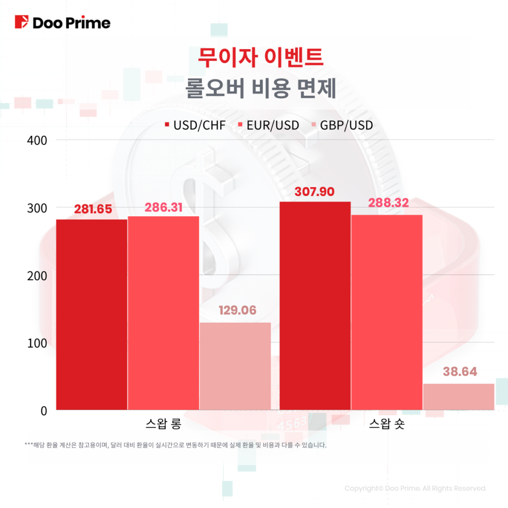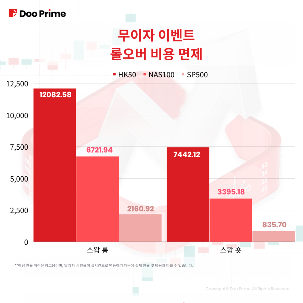Doo Prime 롤오버 면제 이벤트는 2022년 3월 26일부터 진행되었습니다. 2022년 7월2일 이후 Doo Prime은 메이저 통화쌍도 이벤트 범위에 포함시켰습니다. 이로써 메이저 통화쌍, 귀금속, 주가지수 현물, 미국 주식 모두 롤오버 면제 종목입니다.