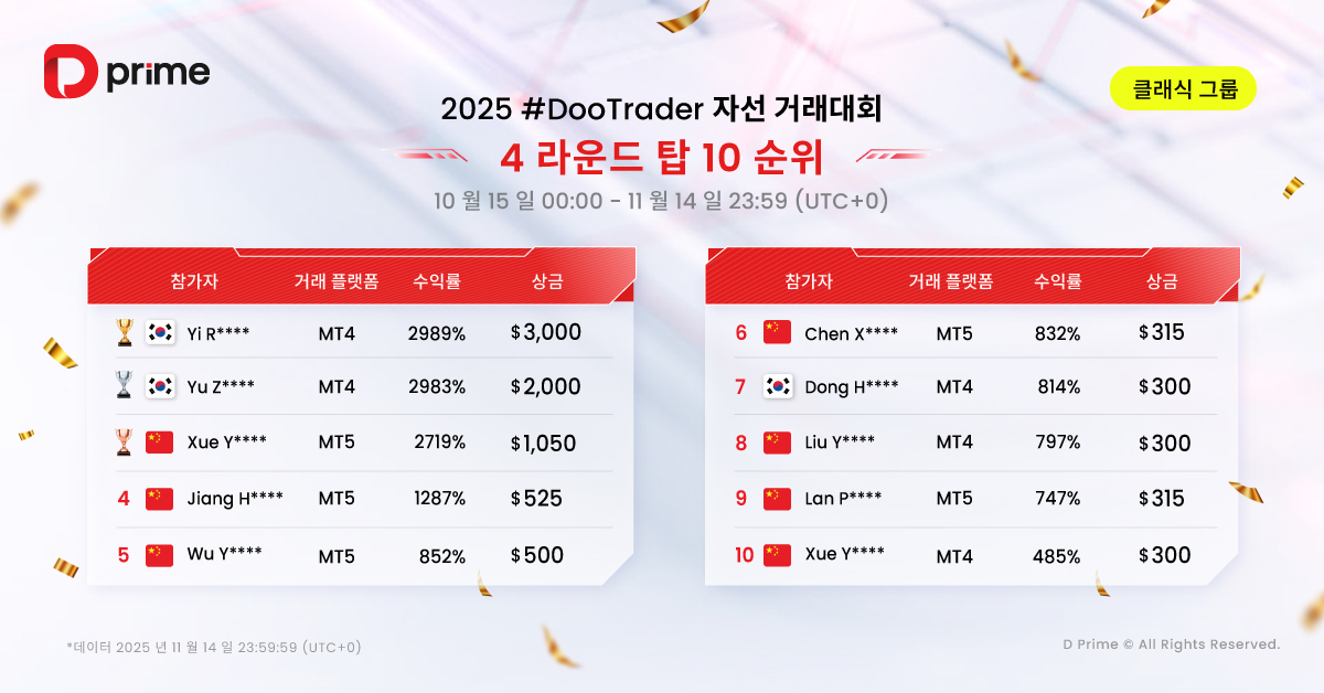 두 그룹의 참가자들은 4라운드 월간 대회에서도 높은 강도의 경쟁을 이어갔습니다. 이번 대회에서도 D Prime의 주요 인기 종목인 XAU/USD, GBP/JPY, USD/JPY, EUR/USD 등이 핵심 트레이딩 종목으로 주목받았습니다.