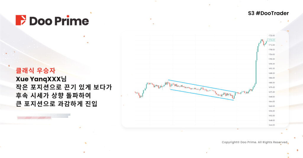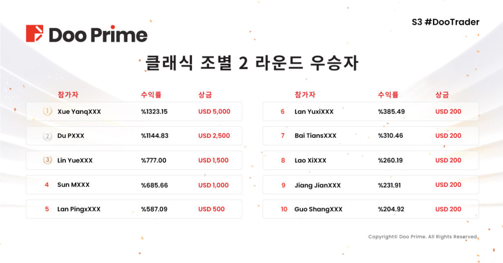 올해 대회를 놓쳐도 아쉬울 것 없이 내년 새 대회를 기대하며 Doo Prime은 더 나은 대회와 풍성한 보너스로 새로운 거래의 기적을 만들어 낼 수 있을 것입니다. 또한, Doo Prime은 S3 #DooTrader 트레이딩 대회 우수선수 인터뷰를 순차적으로 업로드 할 예정이오니 투자 고수 여러분께서 온라인상에서 승리에 대한 비법을 공유해 주시고 계속하여 멋진 모습을 보여드릴 예정이니 많은 기대 부탁드립니다!