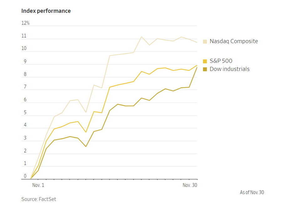 The Dow Jones Industrial Average soared by 1.5% or 520 points on Thursday, showcasing an 8.8% rise for the month and achieving its highest close since January 2022, marking its most stellar month since October of the preceding year.