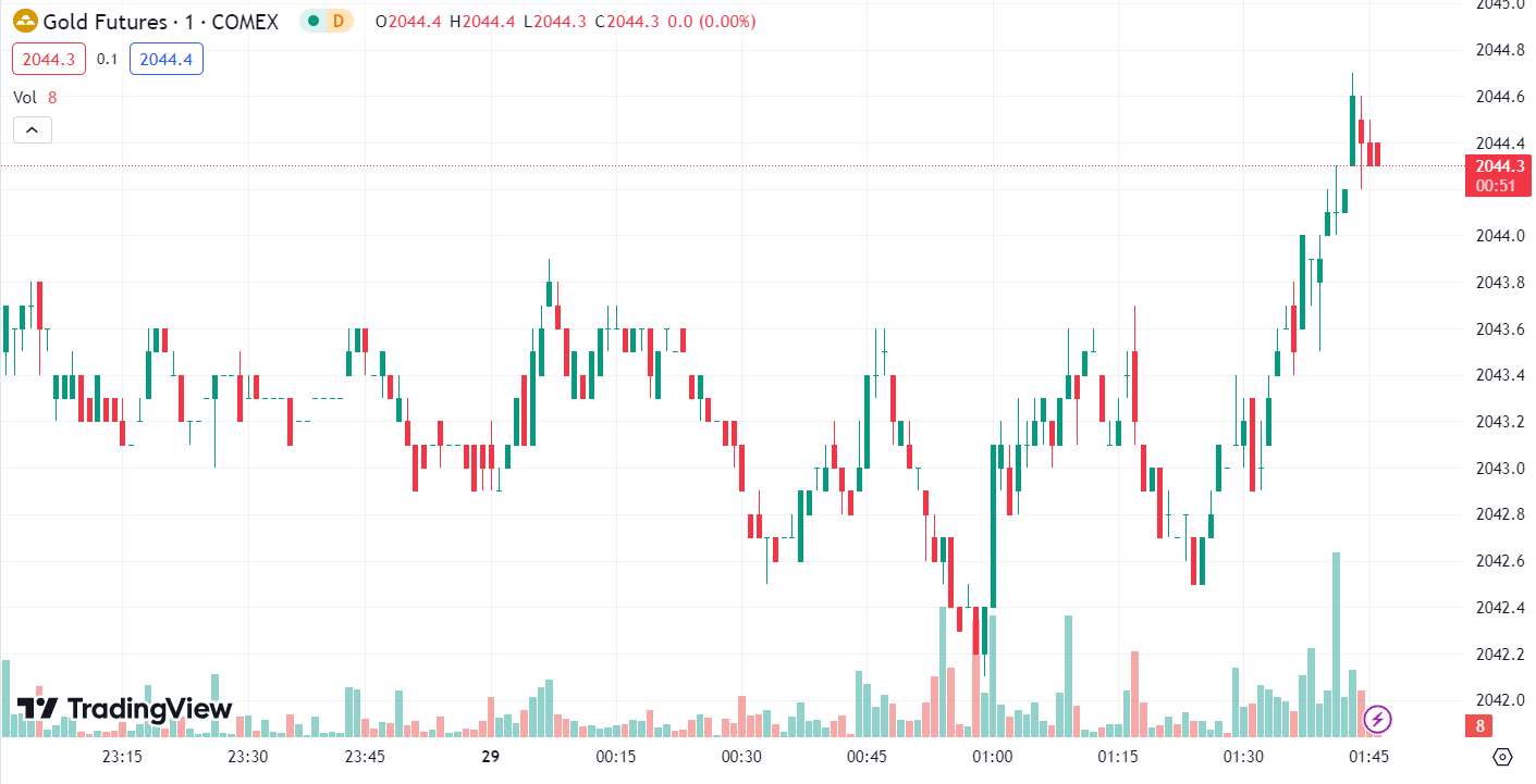 Spot gold surged significantly during the US session, touching the USD 2050 mark, ultimately closing up by 0.48% at USD 2044.26 per ounce; COMEX April gold futures also rose by 0.59%, closing at USD 2054.7 per ounce.