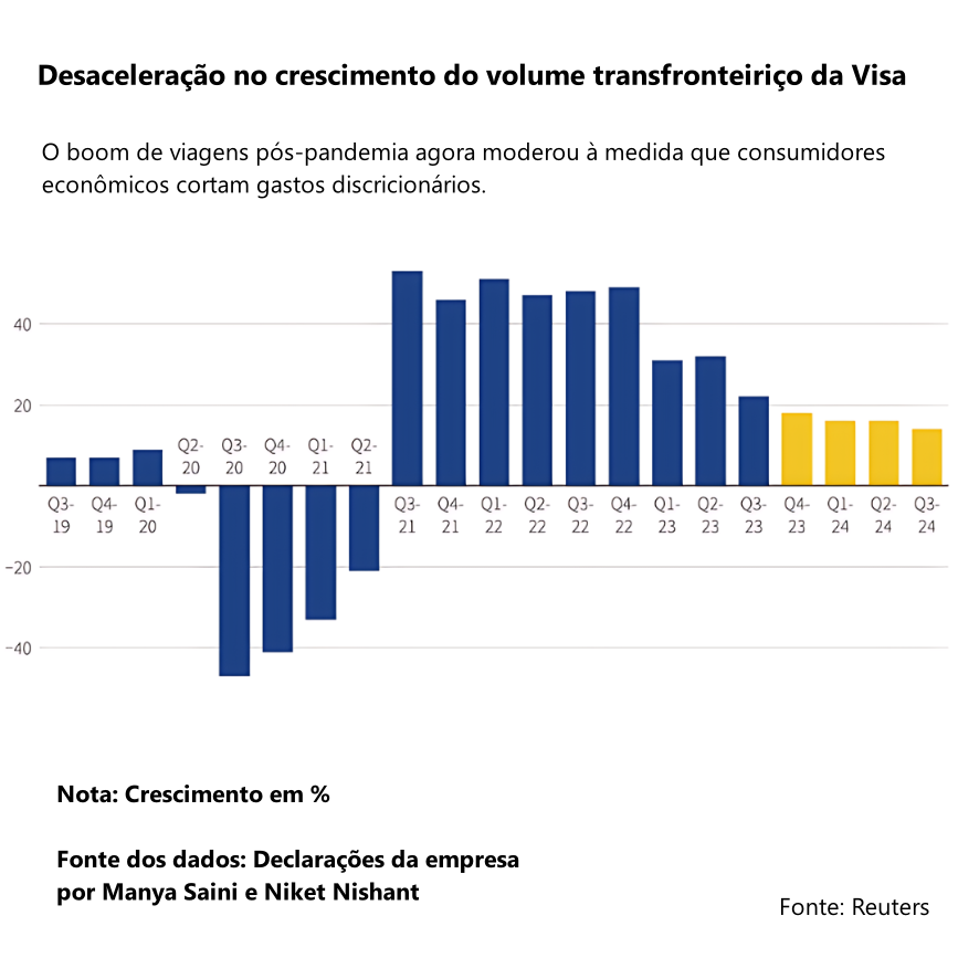 Nas primeiras três semanas de julho, a Visa relatou uma queda nos volumes de pagamentos nos EUA, atribuindo isso a vários fatores, incluindo a interrupção relacionada ao CrowdStrike na semana passada. As ações da empresa caíram quase 4%, para USD 254,13, eliminando os ganhos obtidos anteriormente neste ano, com pelo menos nove grandes corretoras de Wall Street revisando seus objetivos de preço para baixo.