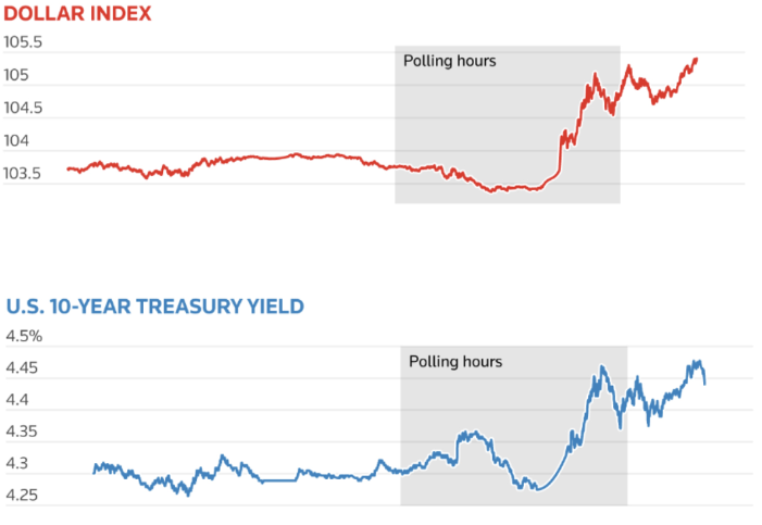 Os mercados também monitoraram de perto os resultados finais nas disputas do Congresso, com o Partido Republicano possivelmente mantendo a maioria na Câmara e ganhando o controle do Senado. Uma presença republicana forte no Congresso poderia facilitar ainda mais a implementação da agenda política de Trump.