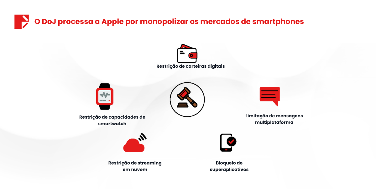 Este ano começou com um processo antitruste importante contra a Apple, iniciado pelo DOJ. A ação alega que a Apple adota práticas restritivas que suprimem a concorrência e a inovação: