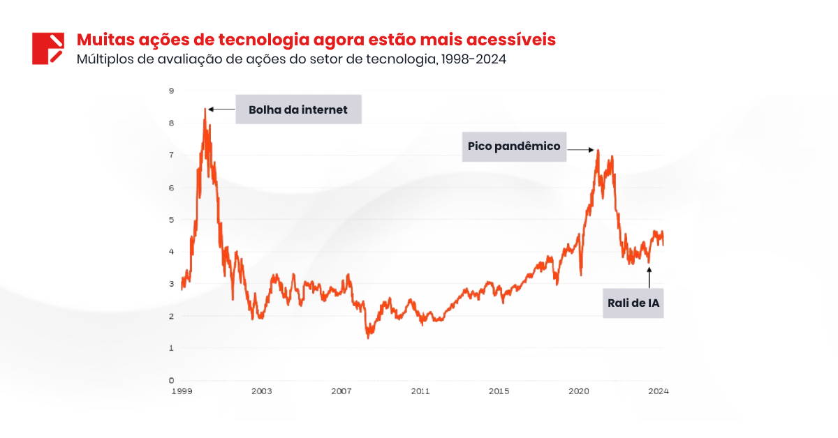 Apesar do crescimento impressionante, alguns acreditam que o boom da IA é apenas mais uma bolha, como a bolha da internet ou o surto tecnológico pós-pandemia. No entanto, olhando para os gráficos, observa-se que, comparado a essas épocas, os valores das ações de tecnologia de hoje ainda são razoáveis, com uma previsão média de crescimento de lucro de 20%.