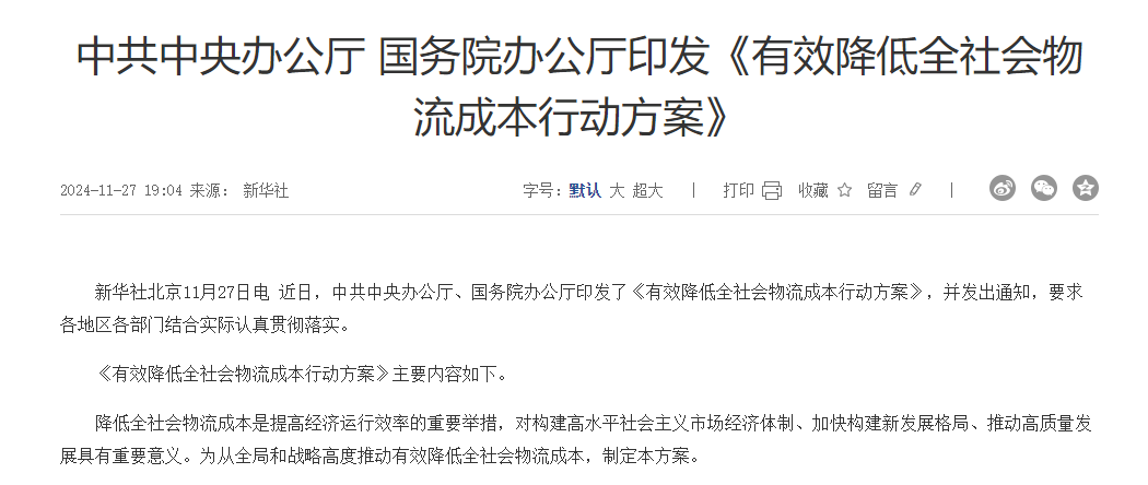11 月 27 日,中共中央办公厅、国务院办公厅印发了《有效降低全社会物流成本行动方案》。