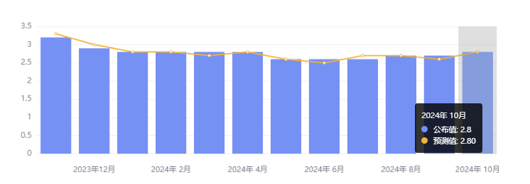 - 剔除波动性较大的食品和能源的核心 PCE 物价指数同比上涨 2.8%,为今年 4 月以来的最高水平,符合预期,9 月前值为 2.7%;