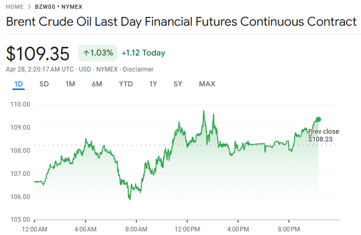 因中东地缘政治局势持续紧张,霍尔木兹海峡的航道解封谈判未见进展,全球能源供应风险始终处于高位。截至 4 月 27 日收盘,布伦特原油(Brent)交易价格维持在每桶 107 美元附近,WTI 原油亦录得 2.1 % 的涨幅。