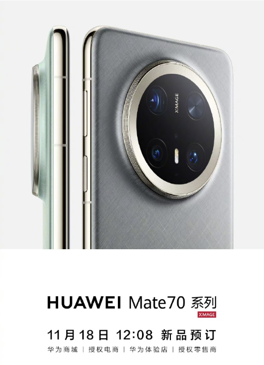 为了预热,华为终端官方微博同时发布了 Mate 70 系列预订海报,产品预订通道将于 11 月 18 日 12:08 开启。华为 Mate 70 系列产品外观也首度公开亮相。