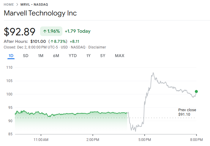 12 月 2 日至 3 日,迈威尔科技 Marvell (MRVL) 传出客制化芯片订单需求强劲,公司预期明年销售额有望增长约 20%,且不再出现此前的需求空窗期。同时,公司管理层表示,明年营收有望突破 100 亿美元,显著高于市场普遍预期,带动其盘后股价大涨逾 8.5%。