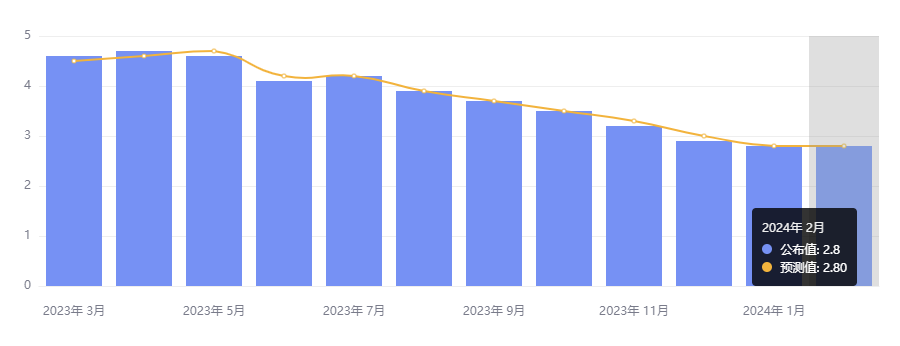 3 月 29 日,美国商务部最新数据显示,美联储首选通胀指标——剔除食物和能源后的 2 月核心个人消费支出(PCE)物价指数同比增速 2.8%,为 2021 年 3 月以来最低水平,持平市场预期,前值修正值为2.9%;2 月核心 PCE 环比增幅回落至 0.3%,符合预期,1 月份该指数环比上修为 0.5%。