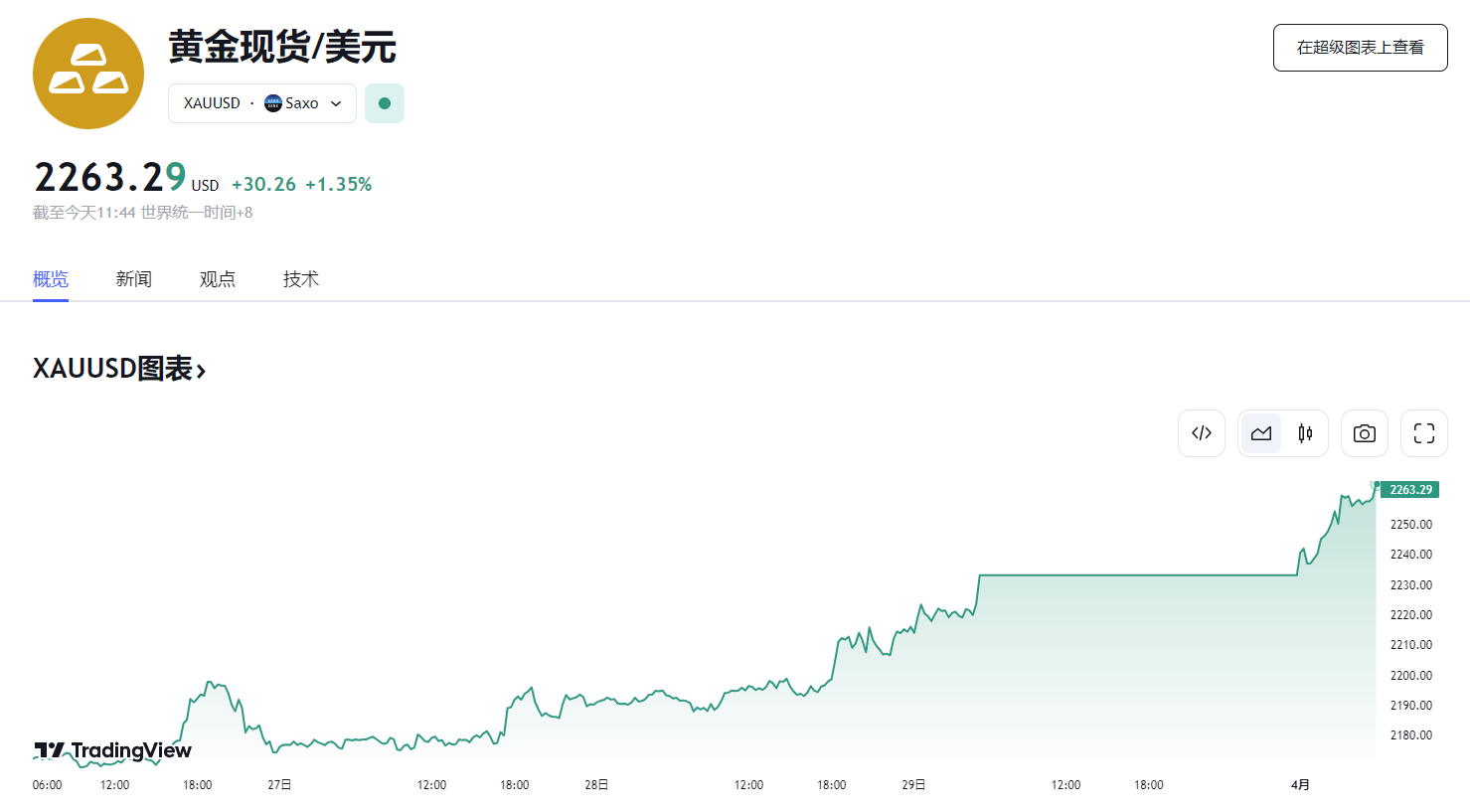 4 月 1 日,亚洲时段,现货黄金价格在日内开盘后便一路走高,首度升破了 2260 美元一线,再创历史新高。