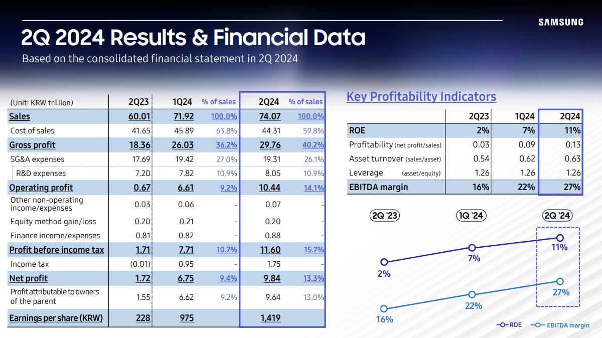 31 日,三星电子公布第二季度业绩报告,营业利润为 10.4439 万亿韩元(约合人民币 547 亿元),同比猛增 1462.29%;销售额为 74.0683 万亿韩元,同比增长 23.44%;净利润为 9.8413 万亿韩元,同比大增 470.97%。