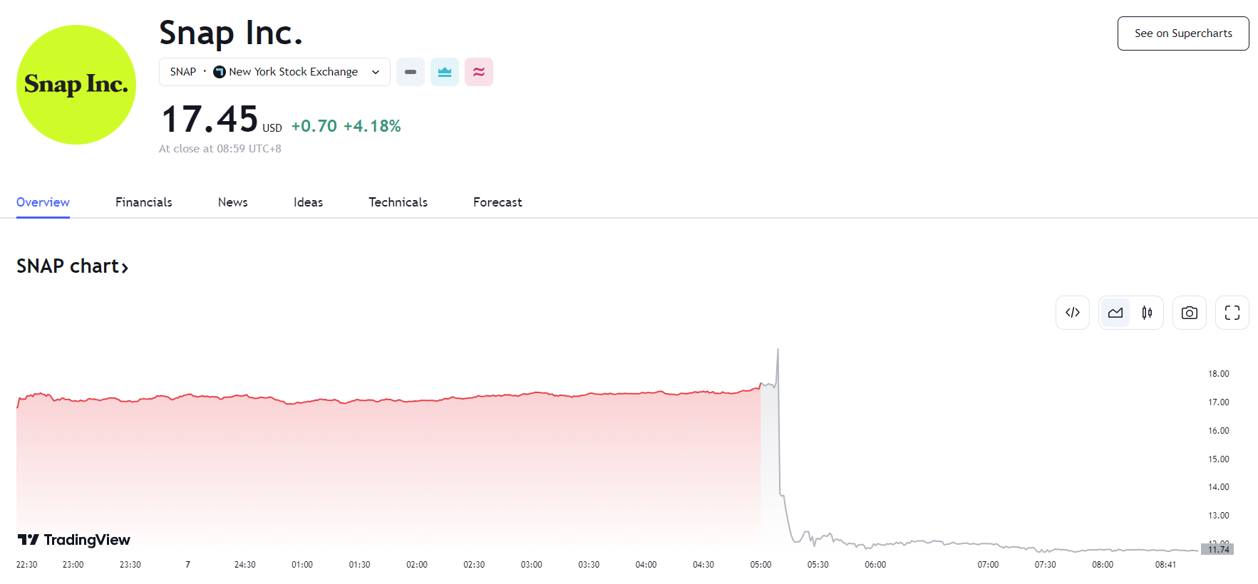 受此影响,原来收涨的 Snap 美股盘后直线跳水,大跌超 32%。