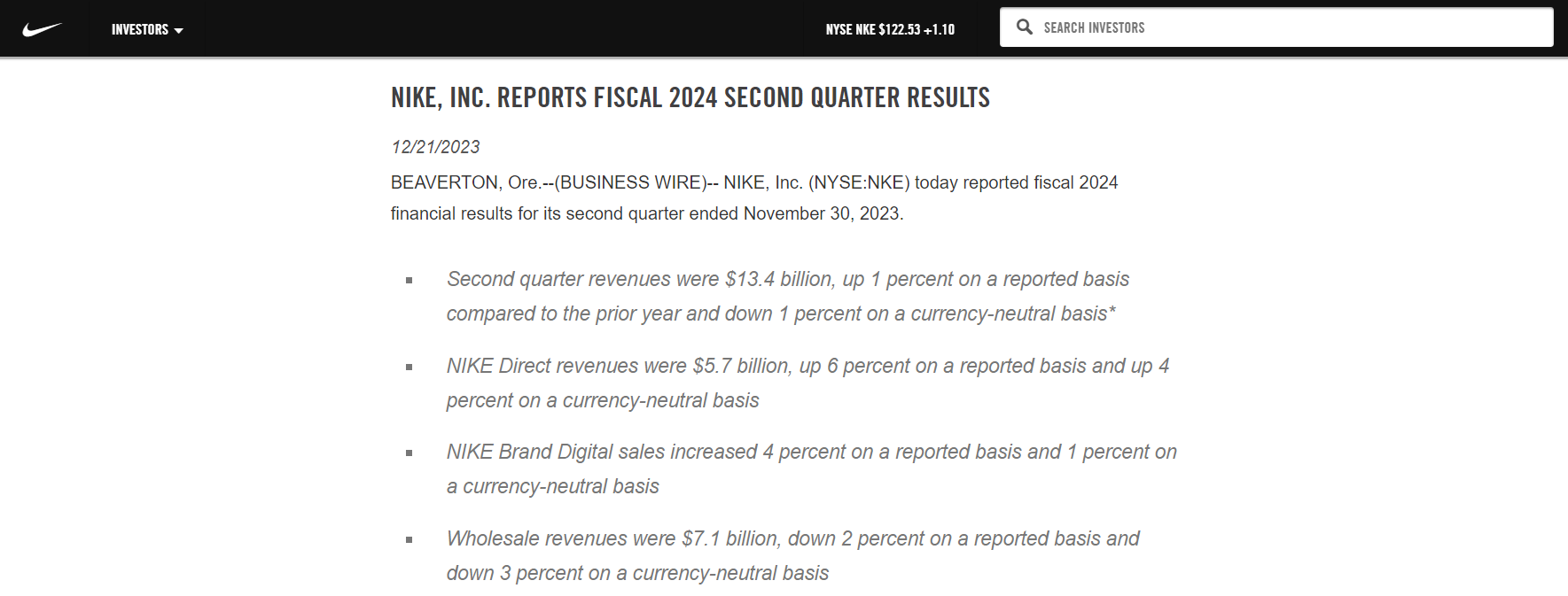 • 毛利率增长了 1.7 %,达到 44.6%,略高于预期的 44%;在过去的六个季度中,耐克的毛利率同比均有所下降,但第二财季的情况有所好转;