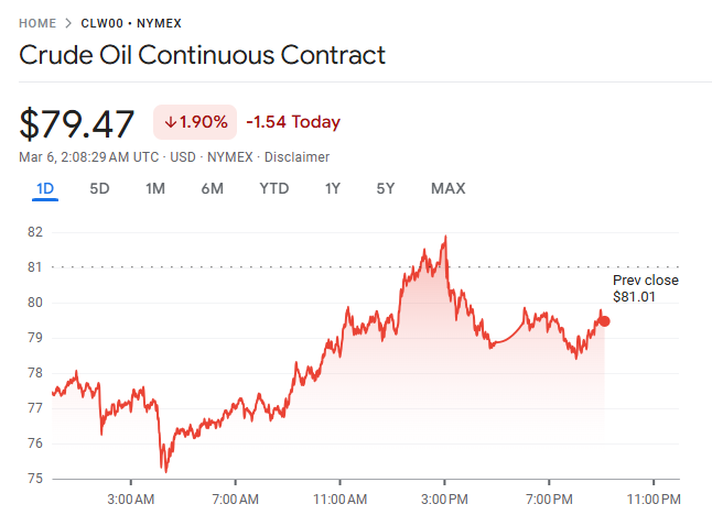 纽约商品交易所 4 月交割的原油期货价格上涨 6.35 美元,涨幅 8.5%,收于每桶 81.01 美元,创下自 2020 年 5 月以来最大单日涨幅。