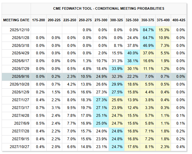 11 月 27 日至 28 日,根据芝商所(CME)“美联储观察”工具数据显示,美联储在 12 月会议上降息 25 个基点的概率已升至 84.7%,维持利率不变的概率为 15.3%。到明年 1 月前,累计降息 25 个基点的概率为 64.7%,降息 50 个基点的概率为 24.4%,仅有 8.1% 的几率维持现状。