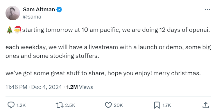 OpenAI 首席执行官 Sam Altman 宣布,从太平洋时间上午 10 点开始,将进行为期 12 天的 OpenAI 活动。在每个工作日,都会有一个直播,包括最新技术或产品演示,有些是重要的发布,有些是小惊喜。