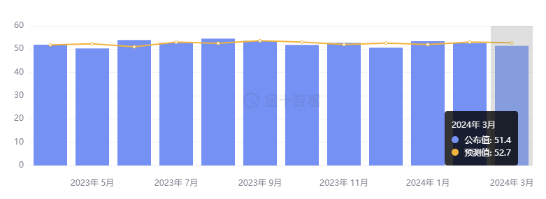 美国 3 月 ISM 服务业采购经理人指数(PMI)为 51.4,不及预期的 52.8,也低于前值 52.6,为连续第二个月放缓。
