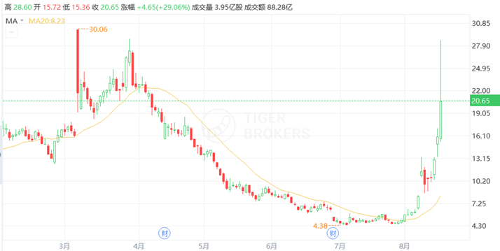 截至周二收盘,该股上涨了 29%,报 20.65 美元,创 4 月 6 日以来收盘新高。