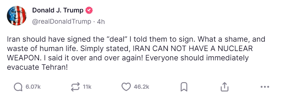 特朗普在其社交平台 “真实社交” 上发文称:“伊朗本应签署我让他们签署的‘协议’。多么可惜啊,白白浪费了宝贵的生命。简单来说,伊朗绝不能拥有核武器。我说了一遍又一遍!大家应立即撤离德黑兰!”