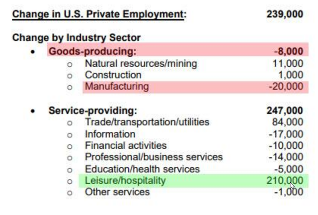 报告显示所有的就业增长均来自服务业,增加了 24.7 万个就业岗位,而商品生产部门则减少了 8000 个就业岗位。因为节假日临近的因素,休闲和接待行业在今年 10 月就新增 21 万就业岗位,同时薪酬涨幅也达到 11.2%。对于旅馆、餐饮、酒吧等相关行业来说,除了季节因素外,新冠疫情的相对缓和也提供了业务反弹的窗口。然而在服务业大类里,除了贸易、交通运输、公用事业板块 10 月新增 8 万余就业岗位外,信息服务、金融、教育、商业服务行业都处于就业减少的状态。