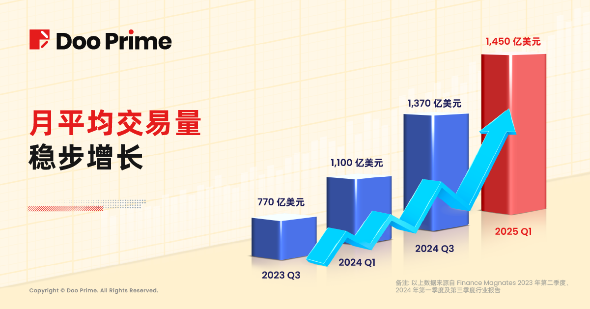 此外,Doo Prime 在 2025 年第一季度的月均交易量达到 1450 亿美元,较 2024 年第三季度的 1370 亿美元增长了约 5.8%,多维数据表明,在全球资本流动加剧的市场环境下,Doo Prime 凭借卓越的全球交易服务实力,持续获得全球交易者的价值认同,品牌国际影响力呈现加速提升态势。
