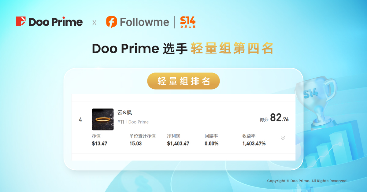 FOLLOWME S14 交易大赛收官,Doo Prime 选手收益率超 1,400%!