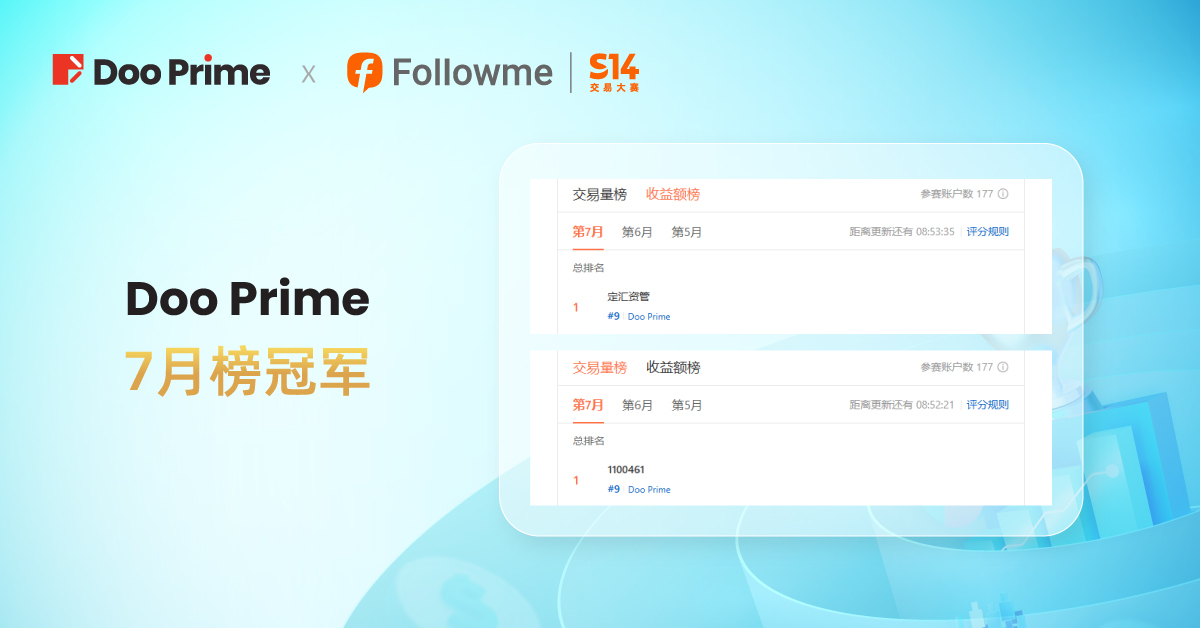 作为 FOLLOWME S14 交易大赛钻石赞助商,Doo Prime 选手可在大赛期间争夺 “月收益榜” 以及“月交易量榜” 2 个单项额外月榜冠军。所有报名参赛的 Doo Prime 新老账户均自动划分至 Doo Prime 月榜,角逐榜单冠军,共同瓜分 1,200 美元额外奖励。