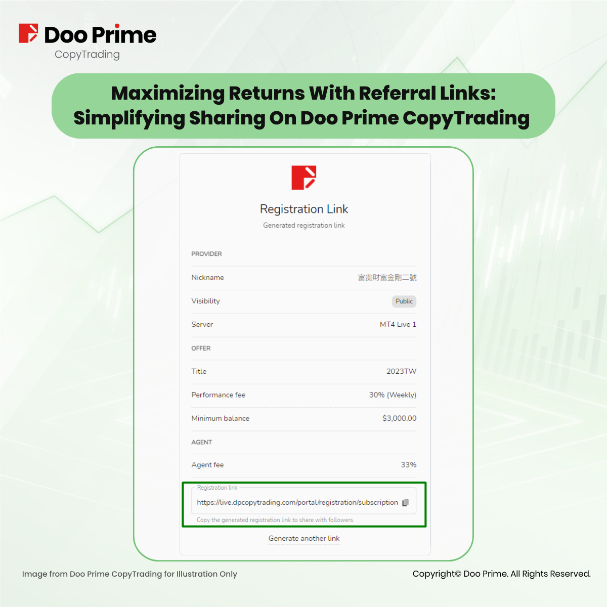 Even if the signal provider remains private, promoters can exclusively circulate it to potential followers through their unique referral links. This innovative feature not only simplifies the process but also motivates followers to actively participate in sharing and nurturing the growth of the Doo Prime CopyTrading community.