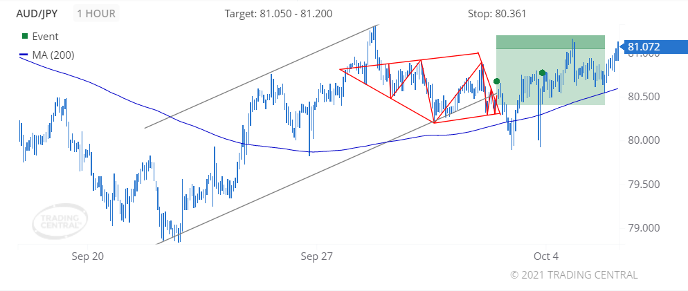 We found a pattern called Continuation Diamond (Bullish) on 2021 Sep 30 at 23:00 GMT on a 1 hour chart, providing a target price for up to 2 weeks in the range of 81.050 to 81.200.