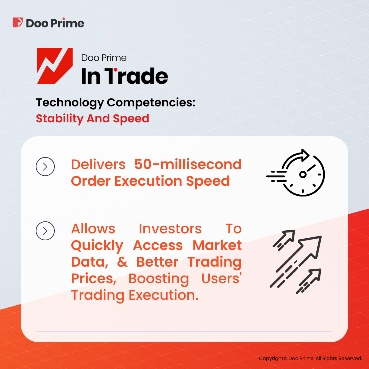 Doo Prime InTrade delivers millisecond order execution speed that only takes up to 50 milliseconds to complete the order. This efficient processing performance ensures that Doo Prime is able to process as much real-time quote data and clients’ orders as possible in the shortest possible time, providing clients with an extremely fast trading experience.