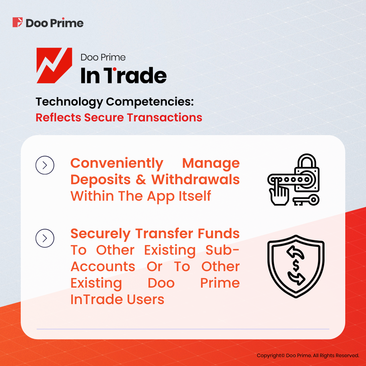 Doo Prime InTrade is developed in a manner where users can conveniently manage their deposits and withdrawals within the app itself. To add, users can even transfer funds to their other existing sub-accounts or even to other existing Doo Prime InTrade users.
